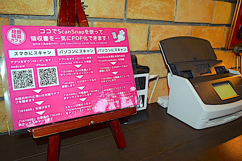 店内には、自由に使えるドキュメントスキャナーが備え付けられ、領収書を一気にPDF化できる。さらにコーヒー・紅茶・お茶などのドリンクも飲み放題だ。