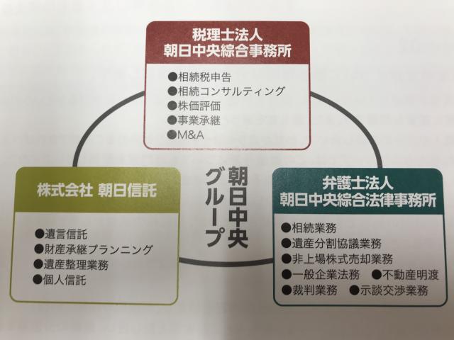 ・税理士法人朝日中央綜合事務所は、法律・税務・財務・信託の総合組織事務所(トータルファーム)である朝日中央グループに所属しています。